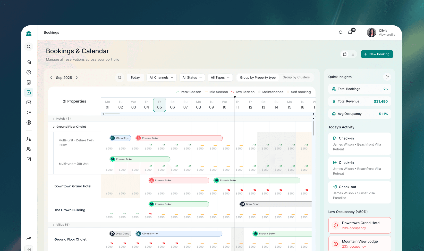 The Bookings & Calendar screen helps property managers view reservations across all properties in a single timeline, making it easier to track availability, bookings, and occupancy patterns.