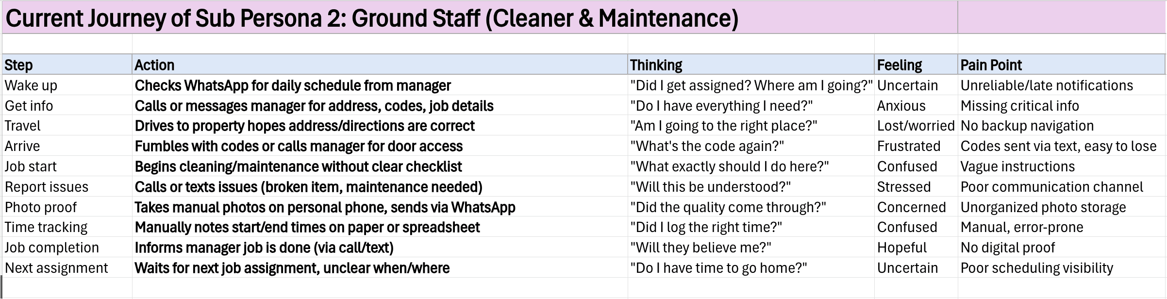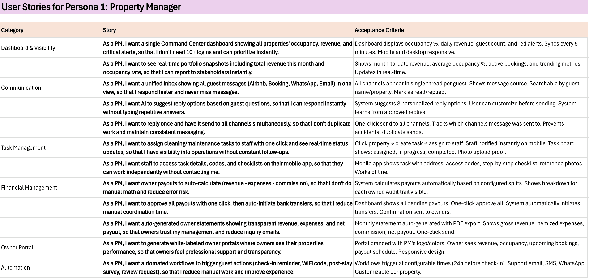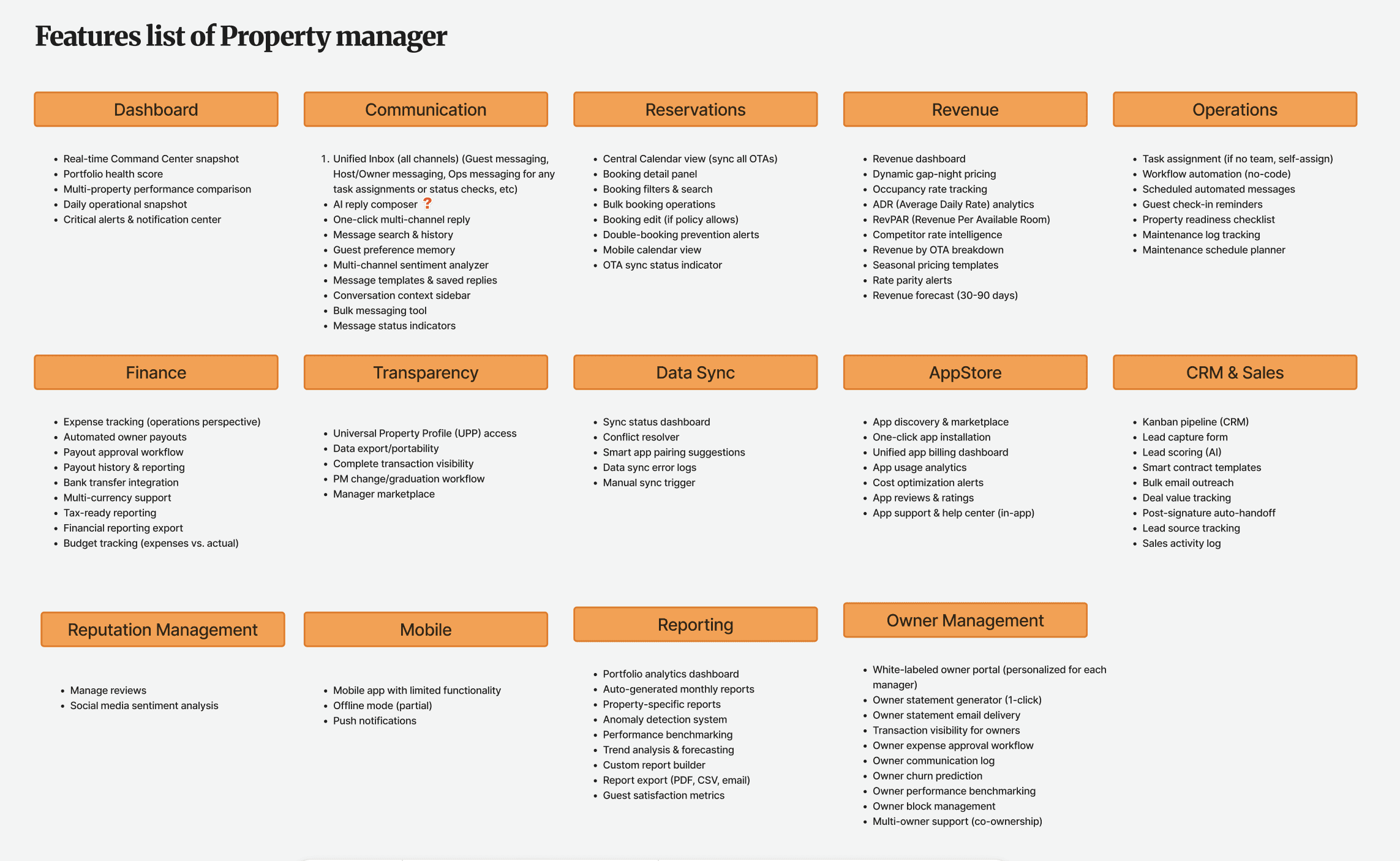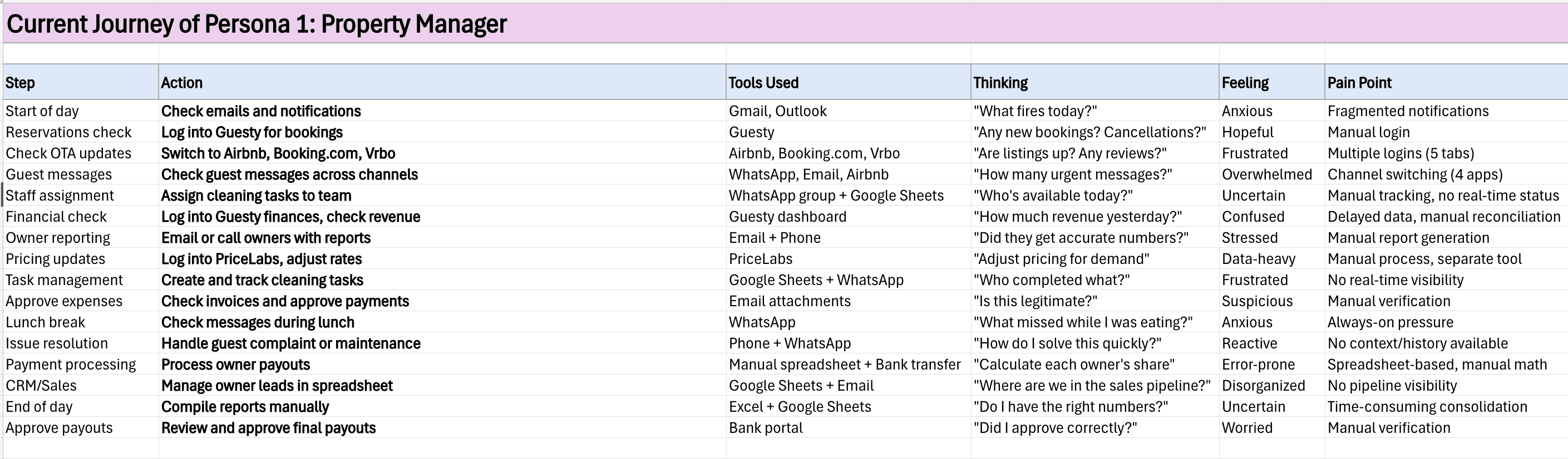 To deeply understand the problem space, I conducted 3 weeks of intensive research, including competitive analysis of 4 major PMS platforms, hypothetical interviews with 15 property managers, and workflow mapping across different portfolio sizes.