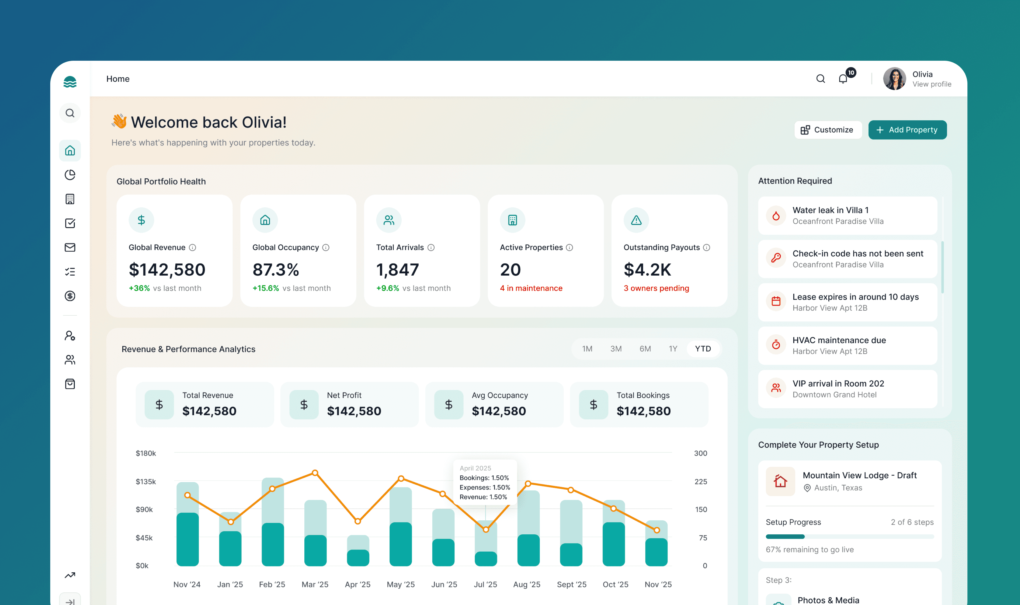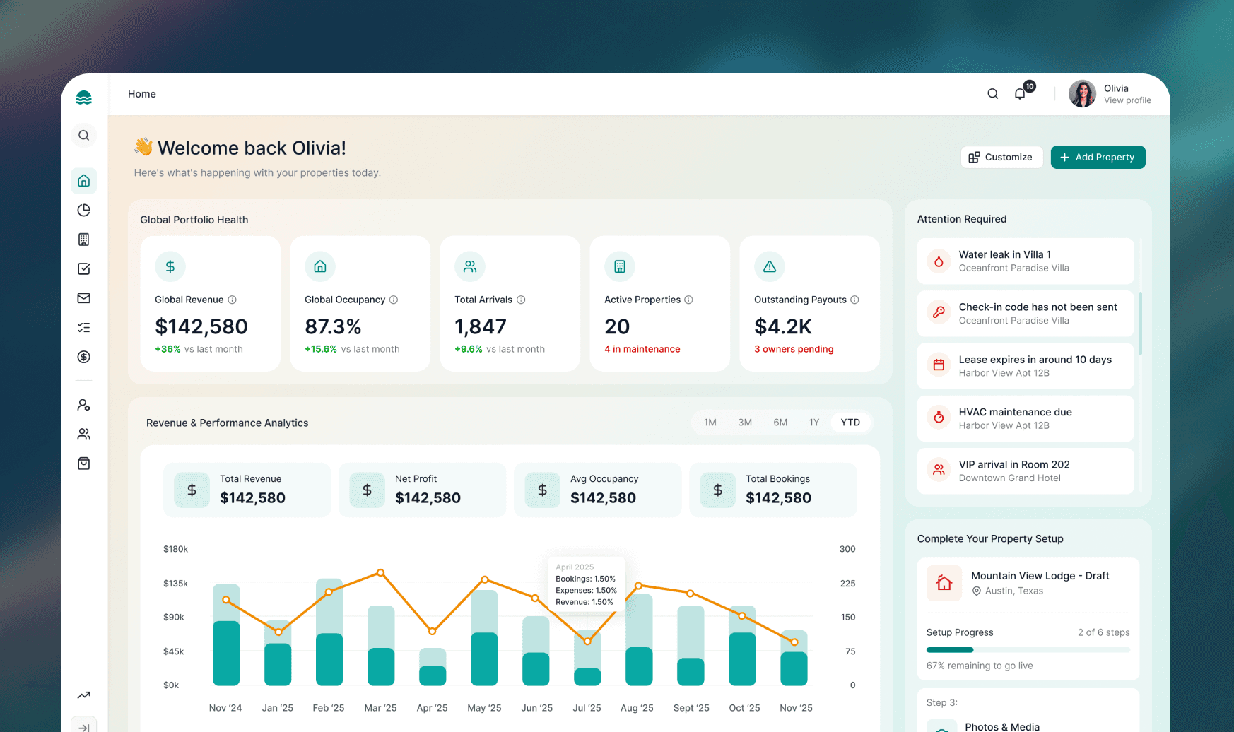 Property managers juggle an average of 10+ disconnected platforms daily—separate systems for channel management, bookings, guest communications, housekeeping, revenue management, and analytics. This creates inefficiency, data silos, increased costs, and missed revenue opportunities.