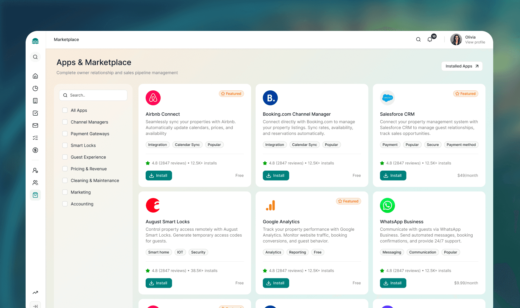 The Apps & Marketplace screen lets property managers discover, filter, and install third-party tools that extend Arbor with channel management, payments, smart locks, analytics, and communication integrations.