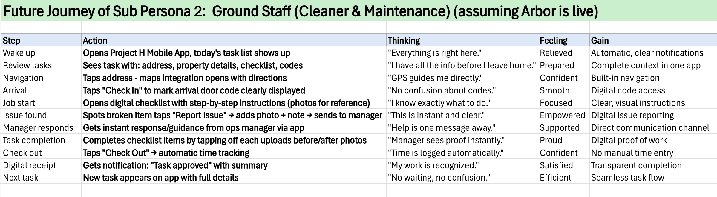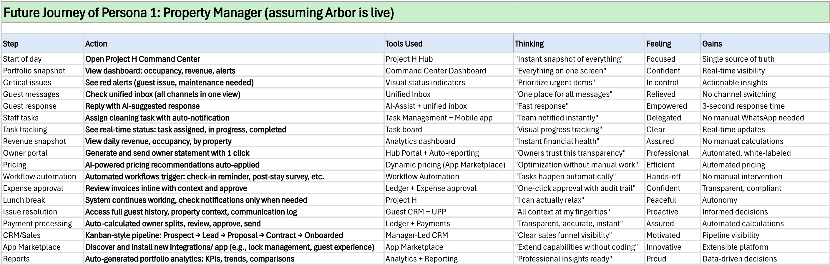 User journey mapping visualizes how each persona experiences hospitality operations before and after Arbor, revealing friction points in the current workflow and the design opportunities that simplify it.