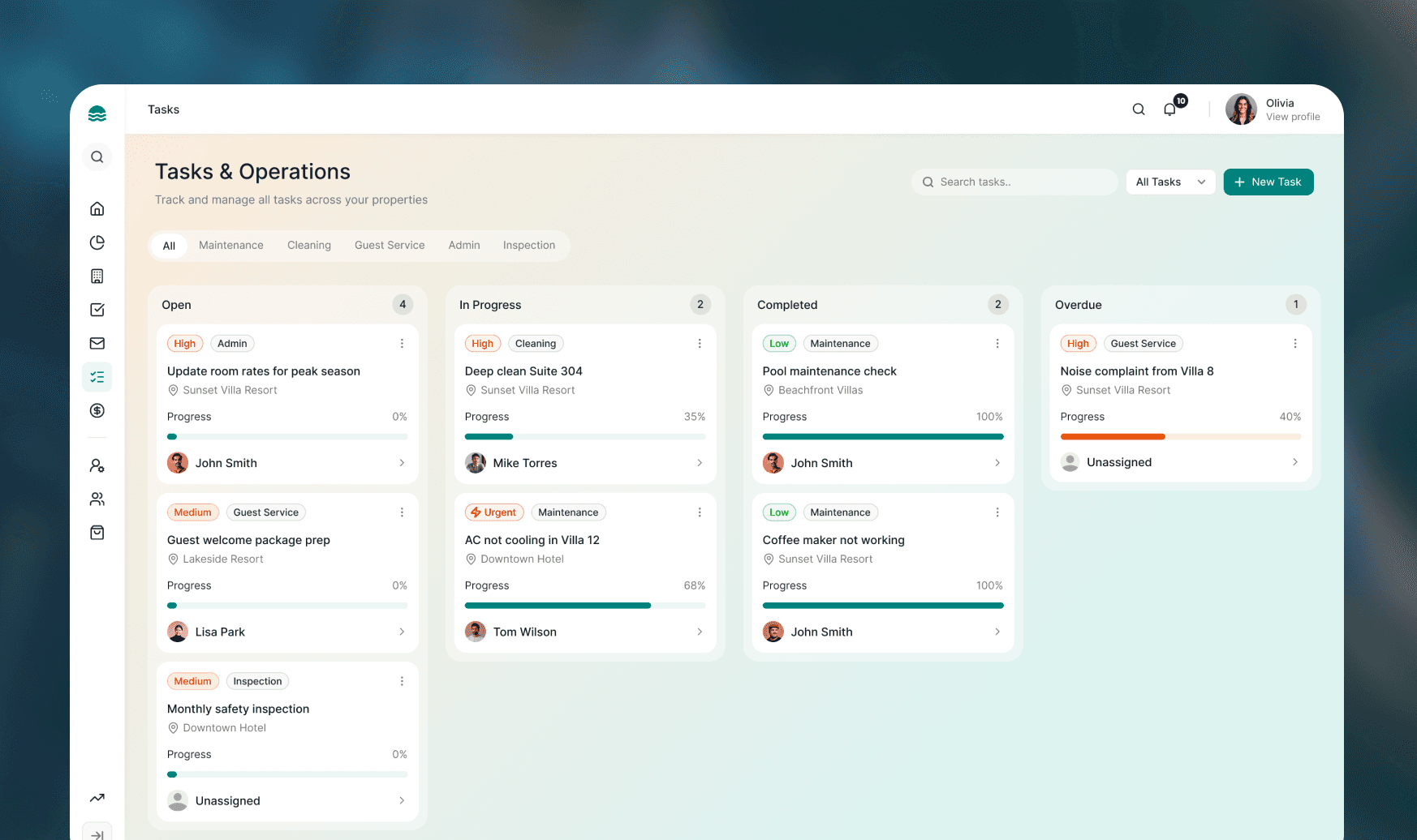 The Tasks & Operations screen organizes work by status and priority, helping managers assign, track, and resolve maintenance, cleaning, and guest-service tasks across properties.