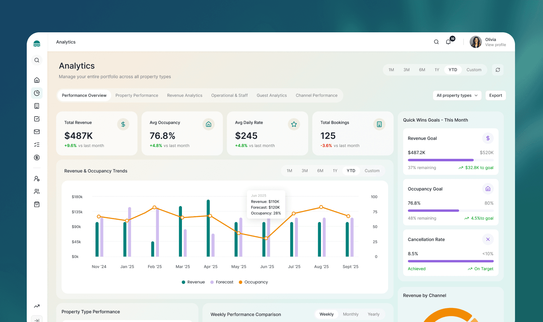 The Analytics module gives property managers a deeper view of performance across Revenue, Occupancy, Bookings, and Goals, helping them track trends and make data-backed decisions.